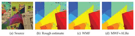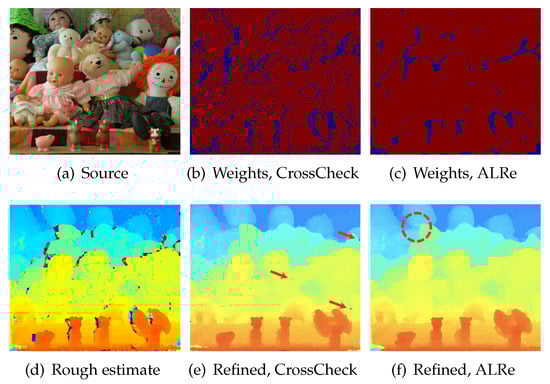 Hosni et al. [25] traced outliers by cross check, which requires the image of another view. ALRe is applicable without this extra information. The binary results of these two methods are shown in Figure 3b,c, and the refined maps are displayed in Figure 3e,f. As can be seen, although the seams are missed, ALRe reveals most occluded regions. The refined results are similar and comparable even though ALRe has much less information.