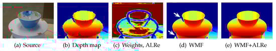 Cross check is not always valid because it requires at least two views of the same object. It is invalid to single view equipment such as RGB-D camera. The depth map of RGB-D camera usually contains unstable edges due to the shifted position and low resolution of depth camera, as illustrated in Figure 4a,b. This problem can be solved by WMF. As shown in Figure 4d, the winding edges are well regularized, but the values of the pointed regions are wrong picked. These regions have zero values because they are invisible to the depth camera and thus should not be considered in picking. With the help of ALRe, these regions are trivial in WMF, and a more convincing result is achieved.