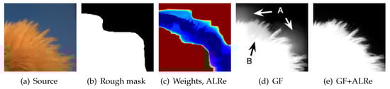 Image feathering produces an alpha matte of complex object based on rough binary mask, which can be obtained manually or from other segmentation methods. GF is an efficient tool but not error-tolerant enough since it treats all pixels equally. Masks with obvious errors might lead to halo-effects. As shown in Figure 5d, the result of GF inherits the errors from Figure 5b, leading to the over-estimated and under-estimated results marked by A and B, respectively.