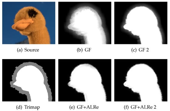 The size of GF is 35 × 35. A larger GF could cover more reliable labels but worsen the halo-effect and texture-copy problems. However, finding outliers based on a large ALRe is safe. Therefore, we use a 51 × 51 ALRe, which can stride over the largest unknown region. For each sample, we produce the rough binary mask, the refined matte based on GF without ALRe and the refined matte with ALRe.