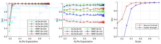The results are illustrated in Figure 12. As can be seen, both ALRe and WMF achieve high accuracy at spike detection. ALRe fails when the ALRe expectation is lower than 0.2. The fewer the outliers, the worse the IoU. It means that ALRe has a true negative problem when the local linear assumption is not established. However, ALRe performs significantly better than WMF at bad region detection. The mean IoUs of ALRe corresponding to the increasing M are 0.978, 0.958, 0.868, while the ones of WMF are 0.814, 0.727, 0.556. The gap is approximately 0.2. ALRe is robust in this task even though the ALRe expectation is very low. For example, detecting outliers from Figure 13b (the ALRe expectation is less than 0.2) is very challenging. WMF only achieves an IoU equals 0.6508 because many outliers happen to be the medians. However, ALRe remains a high IoU equals 0.9027. The undesired hollows in are mostly avoided in . Furthermore, the effects of source contrast and outlier strength are tested by shrinking the intensities of p and toward their mean values. As shown in Figure 12, ALRe maintains high IoUs until the contrast is lower than 70% or the outlier strength is lower than 60%.