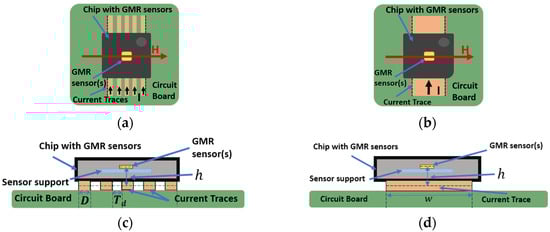 Working principle of the non-contacting current measurement setup utilizing current traces and a GMR based chip: (a) Multi-trace plane section; (b) Single trace plane section; (c) Multi-trace cross section; (d) Single trace cross section.