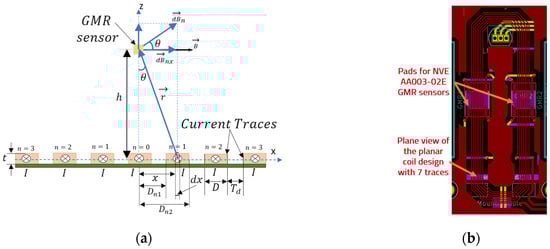 where µ0 = 4π × 10−7 H/m is the vacuum magnetic permeability, D is the trace width, t is the trace thickness (not used in the equation, Td is the distance between the traces, h is the height on which the sensing element is placed above the trace, and θ is the angle shown in Figure 2a used to estimate the Bx component of the magnetic field.
