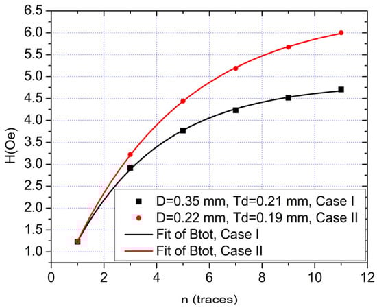 Total magnetic field induction in the GMR sensor area (for I = 0.5 A) dependency on the number of current traces. The asymptotic tendency of Btot for the case where D = 0.22 mm is 6.485 Oe (Case I) while for D = 0.35 mm is 4.849 Oe (Case II). In both cases, h = 0.8 mm. Note that the field multiplying effect is clearly visible. Graphs were made using data obtained with the analytical method.