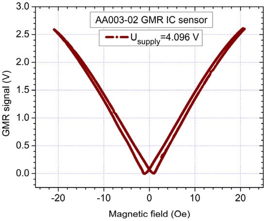 In order to characterize the AA003-02 sensor (Figure 5), a magnetic field was applied by two round-shaped coils in a quasi-Helmholtz like configuration. From Figure 4 and Figure 5, we can observe that the results are in good qualitative agreement with Equations (8)–(10). We can remark that the sensor presents a nonlinear response around 0 field and low sensitivity around the coercive field. We noted that when supplying the sensors with a constant current (2 mA), instead of voltage, the sensitivity of the sensors can be increased []. Due to practical reasons, a constant supply voltage was chosen for the sensors.