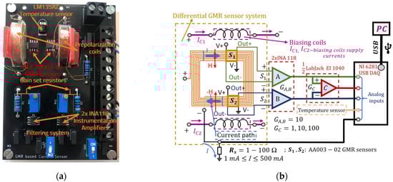 (a) GMR Testboard (custom PCB) optimized for low field detection (current measurement) using GMR sensors. The PCB is based on the 7 traces, Case II from Figure 3 and integrates the sensors, biasing coils, multi-turn planar coil, filtering system (capacitors for the INA 118 amplifiers power supply to filter any high frequency components and for the output of the amplifiers when measuring an AC signal to filter any DC component). (b) The functional block diagram of the current measurement system as well as the amplifier and data acquisition setup; notice the “U”-shaped structure of the circuit which produces the magnetic field which is applied to the sensors is integrated through the spiral trace which constitutes the planar coil.