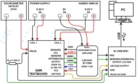 Based on the results from the analytical method, a GMR-based current measurement setup was developed. The PCB setup (named GMR Testboard) can be seen in Figure 6a. Figure 6b shows the functional block diagram of the current measurement system as well as the amplifier and data acquisition setup. Figure 7 details the individual subblock components of the entire setup. A HM8143 power supply (HAMEG, Frankfurt, Germany) is used for powering most components, while a 2635A Sourcemeter (Keithley, Solon, OH, USA) was used to generate the various measured trace currents. In terms of design rules for the current traces, a single trace in a U shaped spiral pattern (7 traces) passes through the sensors. Also, in order to amplify the useful magnetic field, the characteristics are those from Case II (note Figure 3). Due to the thickness of the trace, the setup is able to operate with currents up to 0.5 A, however, for testing we focused on values up to 150 mA, as higher values can easily be detected. The GMR sensors, from an output point of view, operate in antiphase, in a similar differential setup as the one detailed in [], which provides some benefits: high sensitivity, immunity to any external homogenous magnetic field affecting both sensors equally or from magnetic fields lower than 25 Oe perpendicular to the axis of sensitivity. However, for non-homogenous magnetic fields in the vicinity of the sensors, electromagnetic shielding must still be applied.