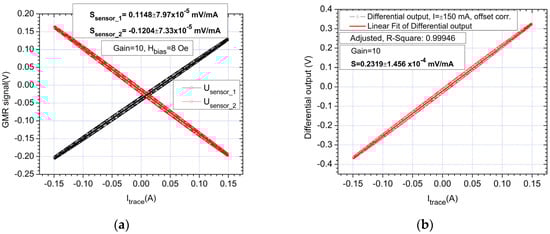The results presented in this section are a summary and focus on demonstrating the low currents sensing capabilities of the proposed setup (Figure 6a,b). As shown in Figure 5 and in [], bias for the sensors is needed for the output to be linearized. Note that for all results, the real sensor sensitivity is shown (without amplification). As mentioned previously, the main challenge is low currents measurements, since higher currents can be easily detected with the setup from Figure 6 for example by integrating a copper bar on the PCB backside. In Figure 8, the response obtained with the setup by measuring a variable DC current between ±150 mA is shown. The sensitivity of the measured differential output is Smeasured = 0.2319 mV/mA which shows a good correlation between the theoretical and experimental results.