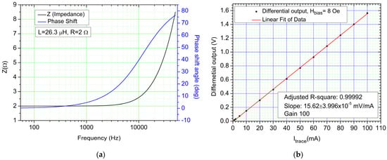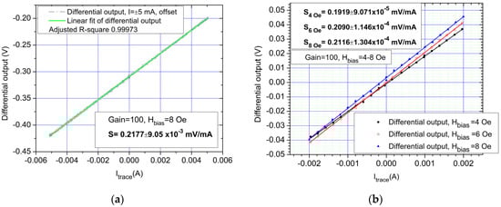 AC response of the system, 8 Oe biased sensors, 1000 Hz sine waveform at 10 mA: (a) Differential output and trace current time dependency; (b) Differential output of sensors. The sensitivity for the sensors in the case is S = 0.2228 mV/mA ±9.6 ×10−5. Notice the sensitivity level is similar to that of DC measurements.