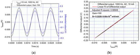 Figure 13b shows the AC calibration curve for the device within the 0–100 mA range when measuring a 100 Hz sinewave. We used the adjusted R-squared term to show how well data is aligned over the fitting line. The adjusted R-square is 0.99992. The sensitivity of the entire setup in S, in the 0–100 mA range is 15.62 mV/mA. Note that there is a very good correlation between the measured current and the response of the system.