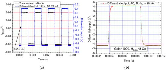 (a) AC response of the system, 8 Oe biased sensors, 1 kHz square waveform at 20 mA: a rise time and fall time of 15 µs was found in this case (measured between the 10–90% levels); The sensitivity for the sensors in this case is S = 0.2120 ± 7.186 × 10−4 mV/mA; (b) AC response of the system, 8 Oe biased sensors, AC, 1 kHz, 20 mA pulse.