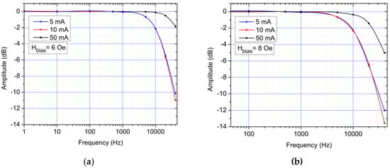 (a) AC frequency response (transfer function) of the system, 6 Oe biased sensors for different measured currents; (b) AC frequency response (transfer function) of the system, 8 Oe biased sensors for different measured currents.