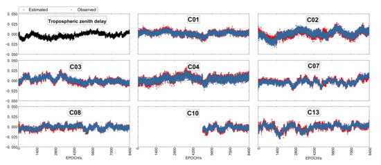 Figure 2, the remaining tropospheric zenith delay is rather stable and fluctuates within (−0.01 m, 0.01 m) with a slight increasing trend. The estimated ionospheric slant delays are of the similar amplitude, but the temporal changing is much fast. More important is that both the estimated and observed agree with each other very well after aligned by a constant. From this example, the ionospheric and tropospheric delays should be estimated in order to reduce their impact on the other parameters, especially the ambiguity parameters and their fixing.