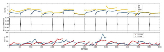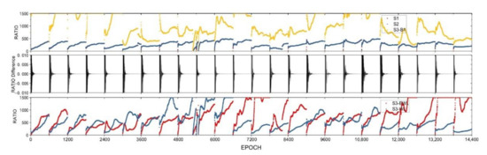 Figure 3, where S3 has three RATIOs with respect to the fixing of EWL, WL and L1 ambiguities, in order to express the state of RATIO time series more clearly, we set an upper limit of 1500 for RATIO value. From the top panel of