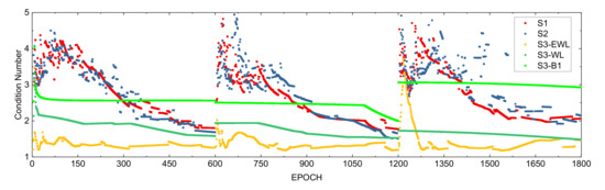 Figure 7 is the number of ambiguity resolution conditions for each of S1, S2 and S3. The condition numbers of the S1 and S2 schemes have a relatively small difference, which means that there is little difference between the two in the searching ellipsoid. The condition number obtained by the S3 scheme to solve the ambiguity of the extra-wide lane is the smallest overall. The search ellipse of the wide lane ambiguity search is still smaller than S1 and S2. For the search interval of the original ambiguity, after the first two steps of correction, the accuracy of floating solution of the original ambiguity has been well corrected. Compared with S1 and S2, although the original ambiguity condition number in S3 is larger, it is smaller than S1 and S2 in the initial stage. It can be seen from