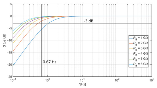 In general, the capacitive electrodes have a sensing area in the range of a few cm2, e.g., the work by Bednár et al. [17] presents the sensing area of 16 cm2, and the work by Hou et al. [18] uses an area of 12.56 cm2. Assuming such size of the sensing surface (assumption with clothes with thickness less than a few mm), the Ce capacitance between the skin’s surface and the electrode reaches a value range from 10 pF to a few hundreds of pF. This fact implies that the high-value bias resistor (GΩ) must be used to acquire bioelectrical signals in the required frequency bandwidth. The RB bias resistor dependent transfer characteristic, with the assumption of Ce = 150 pF (also used in work of Babusiak et al. [4]), is shown in Figure 2. This figure shows that the usage of capacitively coupled electrodes is not appropriate for the measurement of diagnostic ECG. However, they can monitor ambulatory ECG [19] or surface EMG [20]. The figure also shows that the RB bias resistor value of 2 GΩ is sufficient for monitoring ambulatory ECG while using the capacitive coupling of 150 pF.
