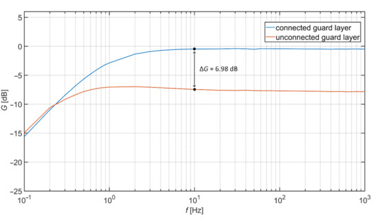 Comparison of transfer characteristics with connected and unconnected guard layer is shown in Figure 4. The cotton with a thickness of 0.45 mm is used as a dielectric material, and the pressure of 1.23 kPa was applied to the electrode. The comparison shows that the involvement of the guard layer improves the transfer properties of AE. For example, the gain difference of the unguarded and guarded electrodes is 6.98 dB at 10 Hz.