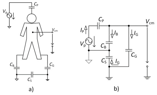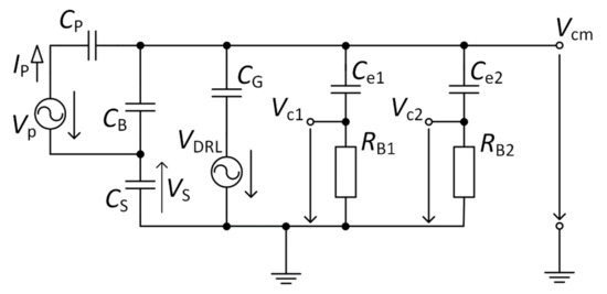 The electrical model of the acquisition system for capacitive measurement is shown in Figure 5. The model is based on similar models presented in [11,21,22]. The parasitic capacitances between the power-line, measured subject, and the device are also considered. The VP represents the power-line source, CP capacitance between the power-line and the measured subject, CB capacitance between the subject and the power-line ground, and Cs capacitance between the ground of the acquisition system and the power-line ground. Values of these capacitances are listed in Table 2 [11,21,22]. These values are indicative, and they depend on the methodology of measurement, environment, and parameters of the measuring device.