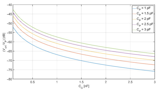 The grounding electrode size is usually more extensive than the active electrode size. We assume the capacitances are in the range of hundreds pF to a few nF. As mentioned before, the CP capacitance changes with the measured subject’s position within the measurement space. This capacitance is changing with the count of other devices connected to the same power network supplied by VP and their distances from the measured subject [25]. The value of CP is lower while using a lower number of supplied devices. The values of CB and CS are considered constant in our analysis (we used values listed in Table 2). Figure 7 shows the graphical representation of Equation (5) with the usage of before mentioned values. We can see that the decrease of Vcm depends on the size of the capacitive grounding electrode and the capacitance between the subject and VP source.