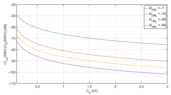 The comparison of common-mode rejection depending on different DRL gain is shown in Figure 10. This graph is made for common-mode voltage at a frequency of 50 Hz. Values of coupled capacitances between the subject and the power-line were set up according to Table 2. In the analysis, we assume the value of Ce1 = Ce2 = 150 pF and RB1 = RB2 = 3 GΩ. This comparison shows that using the DRL circuit and its increasing gain also increases the system’s common-mode voltage rejection. For example, if CG = 1 nF and GDRL = −40, the suppression of common-mode voltage is −60.88 dB and −92.28 dB for electrodes connected to system ground and DRL circuit, respectively.