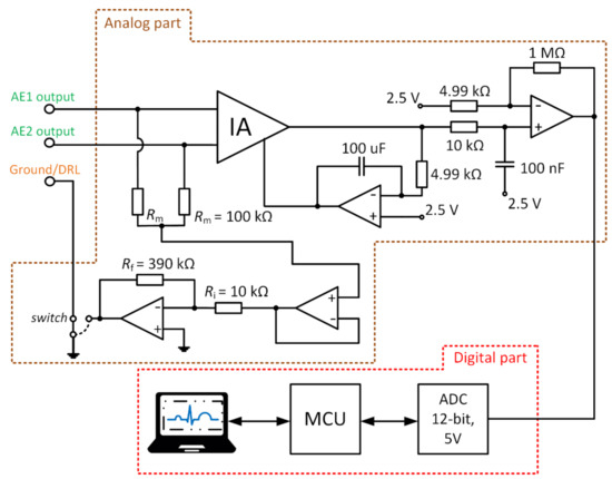 Figure 11 represents the scheme of the designed acquisition system for measurement of capacitive ECG. The digital and analog parts can be identified in the schematic. The analog part uses an instrumentation amplifier (IA.) AD8421 (Analog Devices, Norfolk County, MA, USA) at the input and 4 OAs AD8642 (Analog Devices, Norfolk County, MA, USA). The analog part is supplied by ±12 V bipolar voltage source. The IA deals with acquiring the signals that come from AEs. The OAs provide additional signal gain, filtration, and take part in the DRL circuit. The developed device allows choosing between the GND and the DRL for the NSE connection. The GDRL was set to the value of –39. The digital part provides data digitalization and transmission to the PC. The 12–bit ADC (Analog to Digital Converter) LTC1296 (Linear Technology, Linear Technology, USA) with a 5 V reference was used for digitalization. The ATmega328P (Atmel, San Jose, CA, USA) was used as a control MCU. The gain of IA is 1, and the gain of the successive operational amplifier is set to a value of 201.4. The sampling frequency was set to a value of 500 Hz.