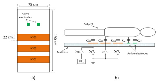 Three NSEs with the size 22 cm × 75 cm and two AEs were placed onto the mattress to experimentally examine the dependency between the system’s common-mode rejection and NSE size. The placement of electrodes is shown in Figure 12a. Similar electrode placement was used in previous papers dealing with monitoring of ECG during sleep [24,26,27,28]. NSEs are made from electroconductive fabric. This fabric is made from a fiber with a core from polyamide and a sheath from pure silver. The same fabric was used by Babušiak et al. [28]. The coupling capacitances between the subject body and electrodes are depicted in Figure 12b. These capacitances depend on the position of examined subject and clothes (dielectric) properties. The total capacitance between the subject and NSEs can be defined as the sum of capacitances connected in parallel. In the case of closed switches S1, S2, and S3, the total capacitance is calculated as