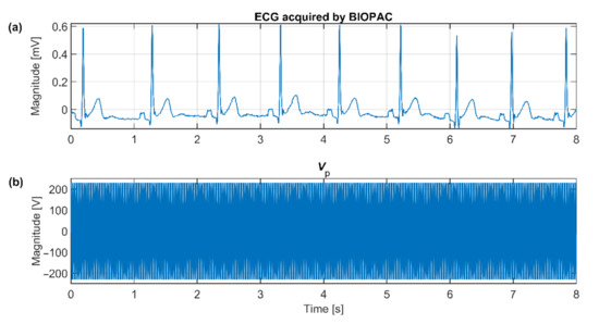 The ECG signal waveform (a) and the power-line voltage waveform (b) used in the simulation.