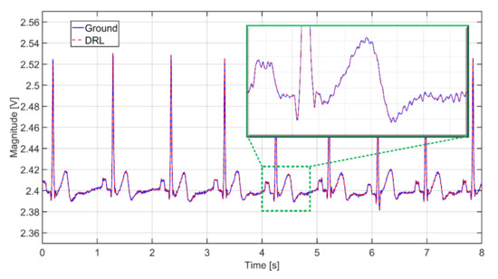 The verification of the DRL effectivity is done by measurement using the same system in Figure 11. The NSE1 is connected to the output of the DRL circuit (see Figure 12). The NSE2 and NSE3 are unconnected. The gain of the DRL circuit is –39. The raw and filtered ECG data are shown in Figure 19. The R peaks are fully recognizable in the ECG signal even if only one NSE is used.