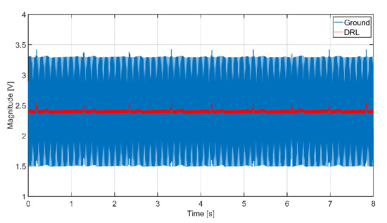 The verification of the presented theory was done by a simulation on the model presented in Figure 13. The first series of the simulation uses the same values of AEs coupling capacitances (Ce1 = Ce2 = 150 pF). The Vout output signals of NSE connected to the ground and the DRL output are shown in Figure 15. As seen from this figure, the common-mode voltage is effectively suppressed in both cases when the coupling capacitances are identical.