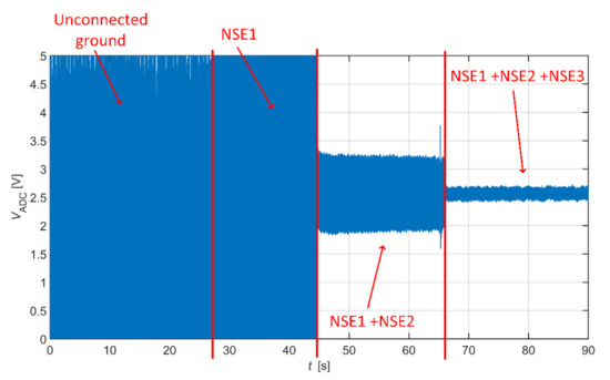 The effectivity of the NSE connected to system ground in common-mode rejection was examined at first. All three NSEs are not connected to the system ground at the beginning of the measurement (beginning of signal in Figure 17), and then they are gradually connected to the ground (rest of Figure 17). The ADC input saturation is observed in situations with unconnected NSEs and with one NSE connected due to a high level of common-mode noise. The saturation is not visible when at least two electrodes are connected. The common-mode rejection increases with an increasing number of connected NSEs.