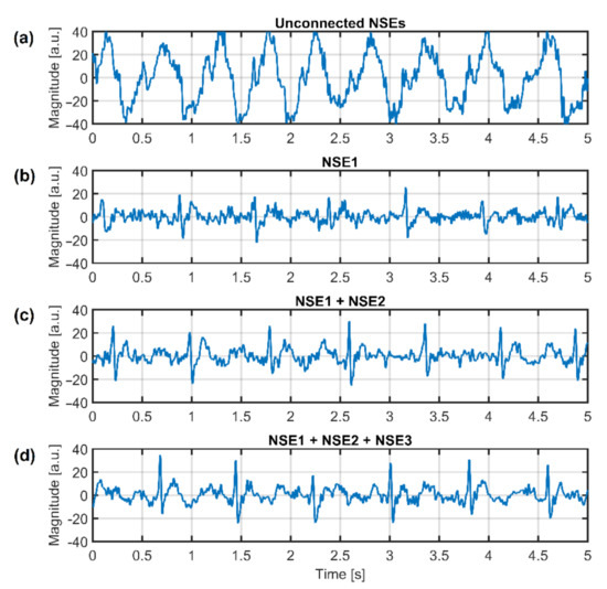 The following table summarizes the power of power-line noise (50 Hz) in the resulting ECG signal when using different noise suppression techniques and the number of NSE. The names of NSE are adapted from Figure 12.