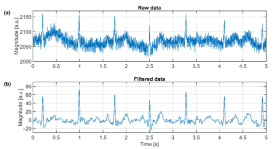 Raw ECG signal (a) and filtered signal (b) acquired by the capacitive system using the DRL electrode.