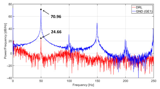 The comparison of power spectral densities of the signal acquired by the capacitive system using passive ground and DRL with the same NSE (position of NSE1 electrode) is shown in Figure 20. The difference between the power at a frequency of 50 Hz reaches 46.3 dB. The comparison also shows that the noise is repeated at the multiples of power-line frequency when using a grounding electrode.