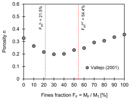 Porosity versus fines fraction. Two red dotted lines indicate low and data-adjusted high-threshold fines fractions computed using Equations (2) and (4). Input parameters used for estimation of two boundaries are eCmax = 0.805, eCmin = 0.533, eFmax = 0.949; eFmin = 0.689, and Fth|L = 21.5%, and Fth|H* = 54.4%. Note: Data extracted from Vallejo [30].