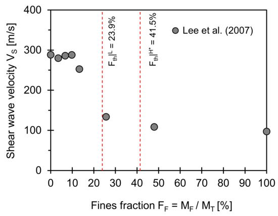 Shear wave velocity versus fines fraction. Two red dotted lines indicate low and data-adjusted high-threshold fines fractions computed using Equations (2) and (4). Input parameters used for estimation of two boundaries are eCmax = 0.85, eCmin = 0.59, eFmax = 0.88; eFmin = 0.56, and Fth|L = 23.9%, and Fth|H* = 41.5%. Note: Data extracted from Lee et al. [21].