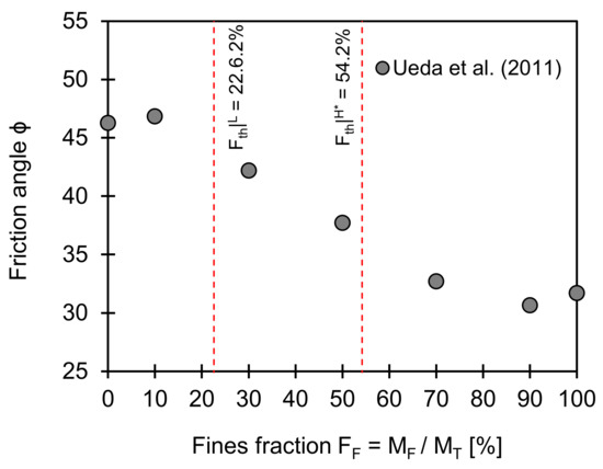 Friction angle versus fines fraction. Two red dotted lines indicate low and data-adjusted high-threshold fines fractions computed using Equations (2) and (4). Input parameters used for estimation of two boundaries are eCmax = 0.737, eCmin = 0.548, eFmax = 0.879; eFmin = 0.56, and Fth|L = 22.6%, and Fth|H* = 54.2%. Note: Data extracted from Ueda et al. [32].