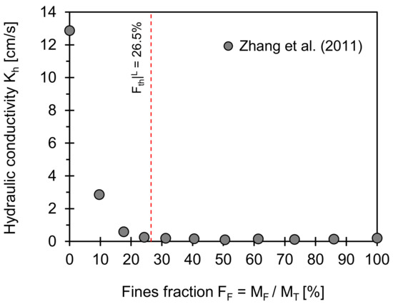 Hydraulic conductivity versus fines fraction. Red dotted lines indicate low threshold fines fraction computed using Equation (2). Input parameters used for estimation of two boundaries are eCmin = 0.45 and eFmax = 1.51, and Fth|L = 26.5%. Note: Data extracted from Zhang et al. [33].