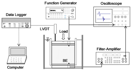The LVDT (TransTek DC 0242, Trans-Tek, Inc., Ellington, CT, USA) connected to a da-ta logger (Keysight 34970A, Keysight Technologies, Santa Rosa, CA, USA) and computer, as shown in Figure 7, continuously monitors the vertical deformation of specimens during the loading procedure. This study selects a parallel type of bender elements to generate and detect shear waves and minimize the effect of crosstalk [36]. The dimensions of bender elements are 12.7 × 8.0 × 0.7 (length × width × thickness in mm) with a 5.0-mm cantilever length. The function generator forms step input signals with a 10-V input voltage (Keysight 33210A, Keysight Technologies, Santa Rosa, CA, USA), and elastic shear waves transformed by the bender element then propagate through the soils. The filter ampli-fier (Krohn-Hite 3364, Krohn-Hite Corporation, Brockton, MA, USA) uses 500 Hz and 200 kHz for high- and low-pass filtering, respectively. The computer saves the signals shown on the oscilloscope (Keysight DSOX 2014A). The minimum sampling frequency of received signals is 1 MHz. The number of signals stacked for a high signal-to-noise ratio is 1024 [37]. The shear wave signals are saved at the end of each loading stage when the deformation reaches an asymptote.