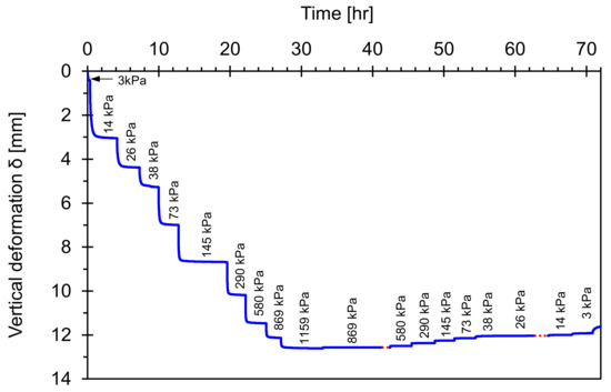 Figure 8 shows the changes in vertical deformation for the original field sample during the loading and unloading history. The vertical deformation increases during the double increment loading process; however, there seems to be significant locked-in horizontal stress during unloading. Once again, this study uses this deformation data to determine the end of each loading step when the deformation reaches an asymptotic trend. Furthermore, this well-controlled load-deformation response provides a typical soil compaction trend in the void ratio versus vertical effective stress space to facilitate further analyses.