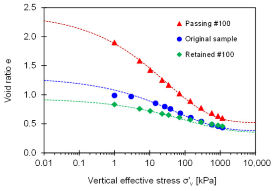 In this context, Figure 9 presents the void ratio versus vertical effective stress for the original field sample, fine-grained soil passing through Sieve No. 100, and coarse-grained soil retained on Sieve No. 100. The void ratio for all specimens decreases with the effective stress. Clearly, there exists an asymptotic compaction trend at very low and high effective stress levels.