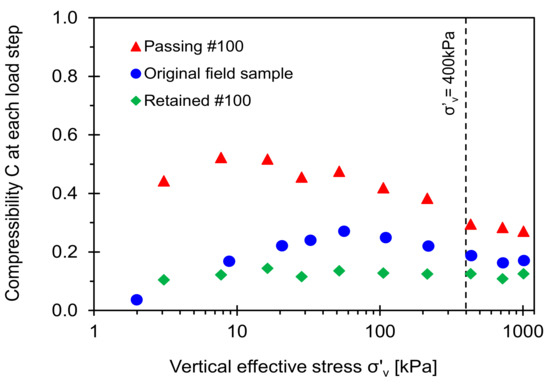 The load-deformation response is not linear, as shown in the semi-log e vs. σ′v space (Figure 9). Therefore, this study emphasizes the change in the void ratio between two consecutive loading steps in Figure 9 that defines the compressibility C = (ei − ei + 1)/[log(σi + 1/σi)] between i and i + 1 loading steps. Figure 10 plots the slop C computed at each loading step as a function of the vertical effective stress. The evolution of the compressibility slope for the original field sample indicates that either coarse, fine, or both grains are likely to contribute to the large strain stiffness at effective stress σ′v < 400 kPa. In particular, the low fines fraction in the original field sample (i.e., FF = 10%) plays a critical role in determining large strain stiffness in the soil classified as a transitional mixture. The slope C for the original field sample reaches an asymptotic trend when the effective stress exceeds σ′v ≈ 400 kPa that may match with an in-situ overburden pressure (note: Sampling depth is 19.20–19.35 m, See similar cases in Yoon et al. [41]).