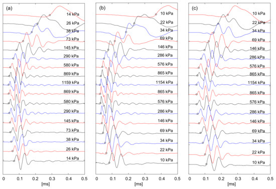 The time to the first arrival for shear waves is determined by considering the near-field effect [36]. The first arrival time for all specimens decreases with the effective stress. Then, the tip-to-tip distance L for the bender elements and first arrival time t provide the shear wave velocity Vs = L/t. The shear wave velocity follows a power function of effective stress [5,42]: