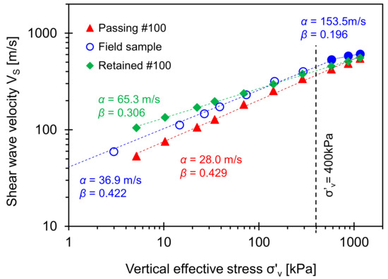 The α-factor and β-exponent for the original field sample obtained at σ′v < 400 kPa is consistent with the α and β values for clayey soils, while the α-factor and β-exponent for original field sample at σ′v > 400 kPa belong to the typical sandy soil group (see reported data in [43]). The β-exponent for the original field sample obtained at σ′v < 400 kPa is slightly smaller than that of the fine-grained soil passing Sieve No. 100. However, there is a clear transition of the β-exponent when the effective stress exceeds σ′v = 400 kPa (i.e., β = 0.422 to 0.196). This observation is consistent with the asymptotic slope in Figure 10 at σ′v > 400 kPa. The bilinear trend in α and β values for the original field sample indicates that the specimen may retain the memory of the in-situ overburden pressure (note: Sampling depth is 19.20 m–19.35 m). In particular, the crossing of the shear wave velocity trends indicates that either fine, coarse, or both fractions will determine the mechanical properties in transitional mixtures despite a 10% fines fraction in the original field sample.