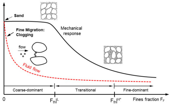 Conceptual drawing of changes in mechanical response and fluid flow in terms of low and data-adjusted high-threshold fines fractions.