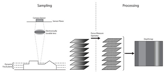 SFF sampling and processing using an ETL. The ETL is controlled to change the focal distance between every captured frame. All frames are then processed using the FMO, the result of this process is then converted in a depth map by either converting the image number of the image with the highest response to the FMO to a depth or by gaussian interpolation.