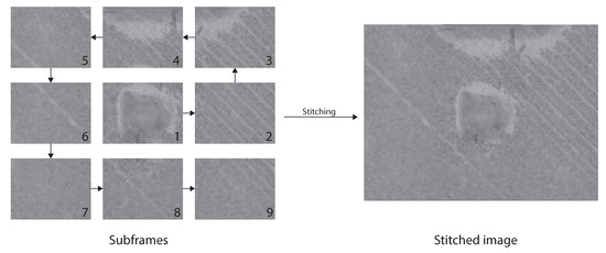 Principle of image stitching as implemented for this paper. Subframes (left) are taken counter clockwise with an overlap of 150 pixels and than stitched together to create an image of a larger area (right).