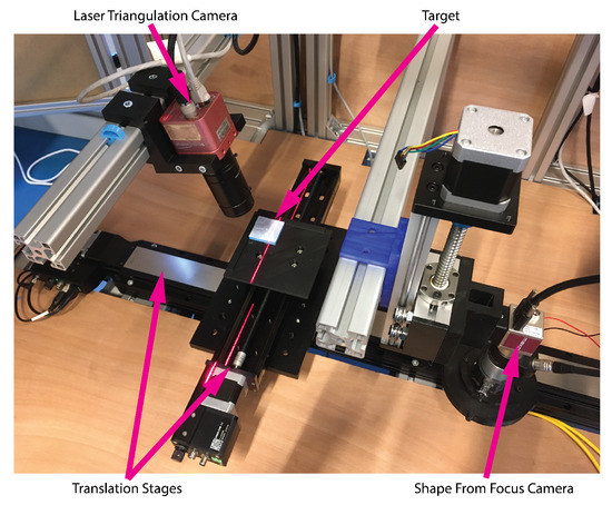 A possible topography method to use for the purpose of creating rough depth-maps is Laser triangulation (LT) also known as Sheet of Light (SoL) or laser ranging sensors [21], but any other method for fast creating a coarse profile can be used. Our setup was built similar to Figure 6 around a PhotonPhocus MV1-D2048-3D04 3D camera with a 12 mm lens, a line laser and a zaber X-LSQ300B translation stage for the third dimension. The camera was placed at a 15° angle to the laser line.