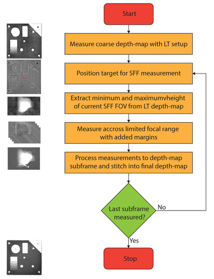 The measurement principle is very simple (Figure 8). Initially, the target is scanned by the LT system and a coarse point cloud is created. This point cloud is then converted into a depth map and scaled to the same resolution as the final SFF depth map. The LT depth map is then cropped and transformed to match the final FOV of the complete target. Now, the current small field of view of the SFF camera can be extracted from the coarse depth map. Next, the information of the extraction from the coarse depth-map is used to determine the minimum and maximum depth boundaries for the SFF scan. With the conventional SFF method, the creation of a subframe would take 150 images measured over a range of 2.5 mm. With this two-step approach, this measurement range is thus reduced to e.g., 1 mm. So, instead of 150 images, only 59 images need to be captured and processed.
