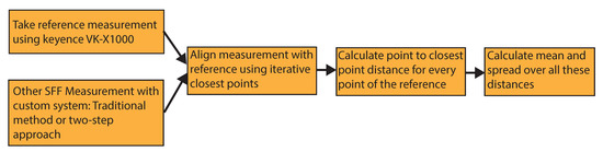 From Figure 11 and the data in Table 2 it is clear that the application of the novel method had no negative influence on the accuracy of the SFF scan. The mean deviation from the reference of and mm has the same order of magnitude for both measurements. The same conclusion can be made for the standard deviation of the measurements, with and mm. The minor difference of 7 μm in standard deviation is negligible compared to the standard deviation of the laser triangulation measurement.
