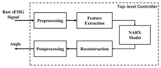 The block diagram of the proposed top-level controller is shown in Figure 5. The raw sEMG data collected from the sensors of the prosthetic hand were sent to the feature extraction module after preprocessing. Then, the features were extracted to construct the input vector for the NARX model. The number of output dimensions of the NARX model was consistent with the DoFs of the prosthetic hand after dimension reduction by PCA. The output of the NARX model was reconstructed into the original dimensions of the controllable joints of the prosthetic hand via inverse PCA. Post-processing was performed to ensure the continuity and robustness of the output target angles in the case of dangerous movements.